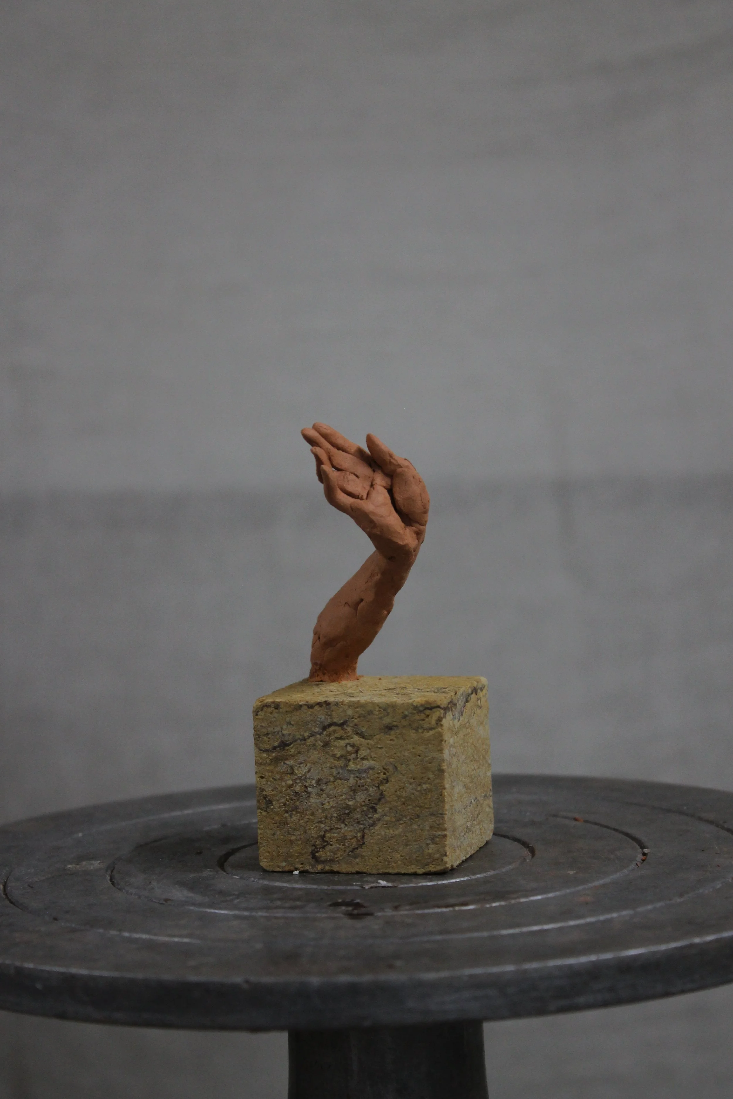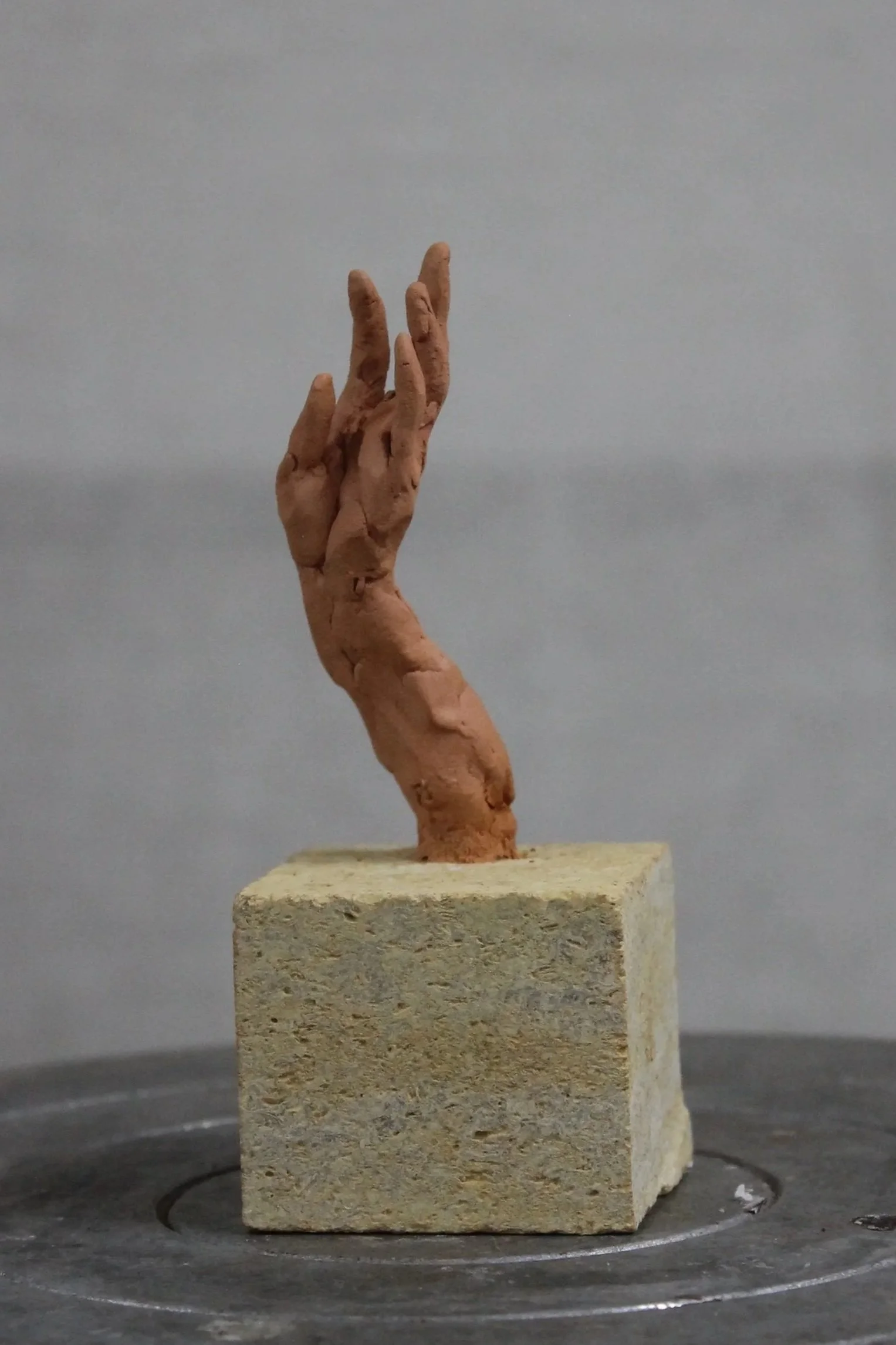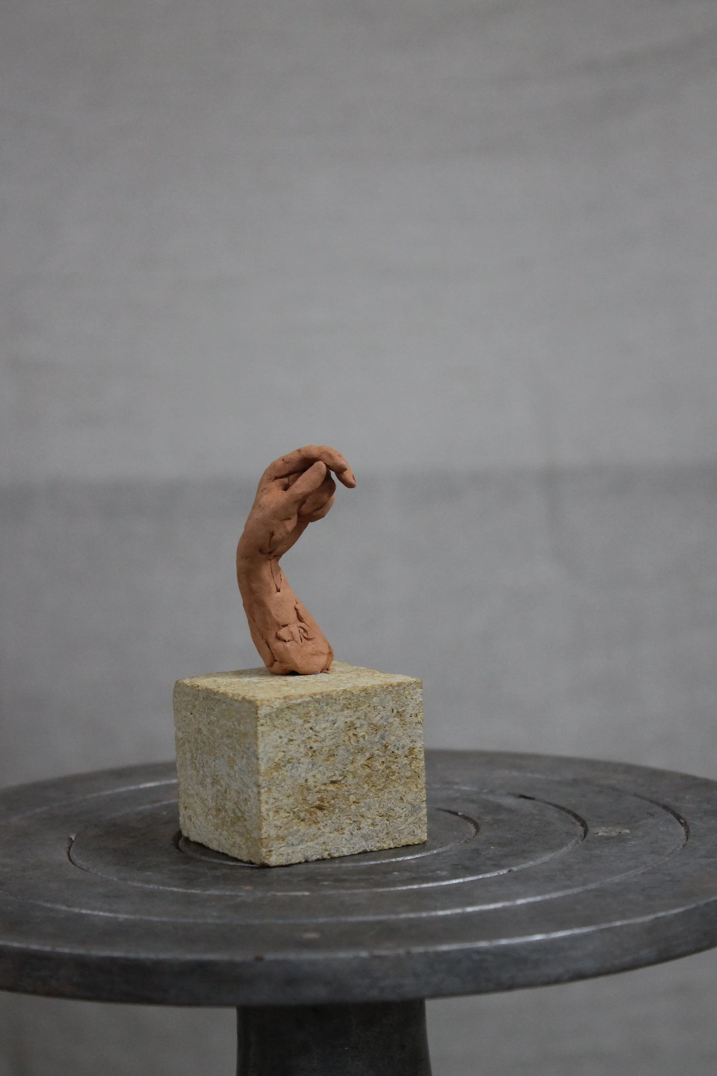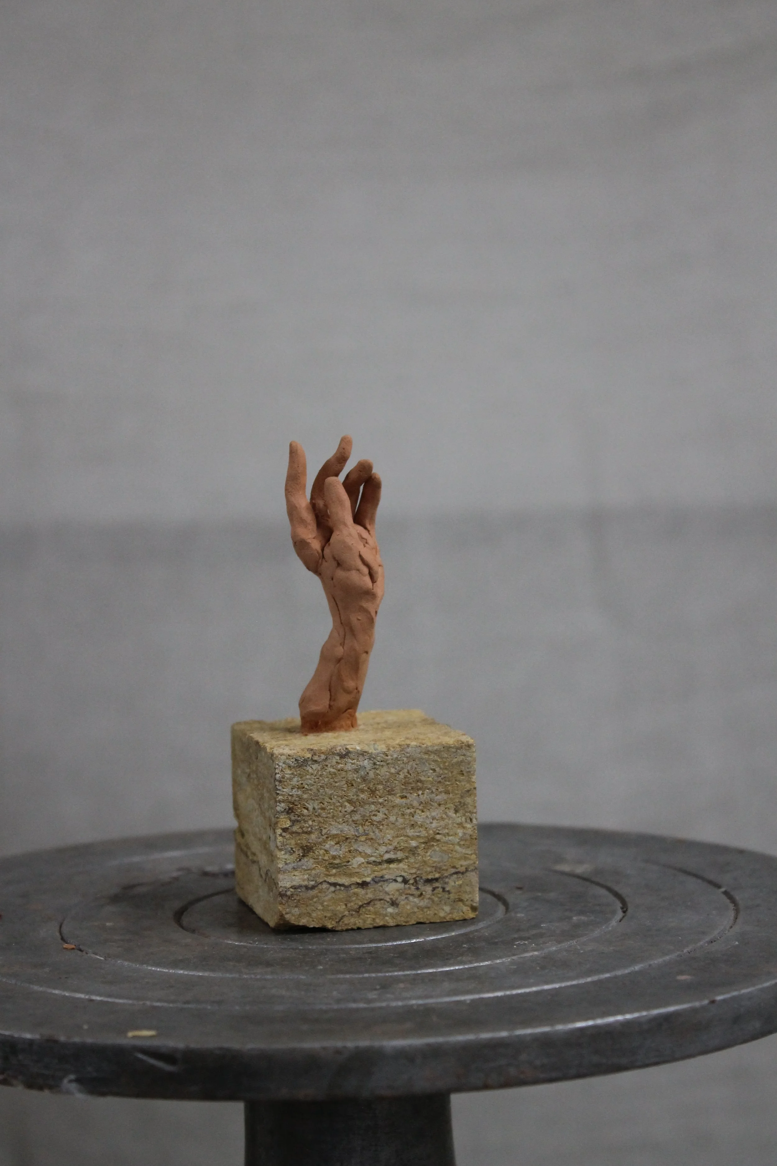 This small terracotta hand, taken from Rufus’s own right hand, carries the direct touch of the artist. It is not part of an edition but a singular piece, preserved exactly as it was sculpted and mounted on stone. Its uniqueness and closeness to the maker give it a quiet, personal presence.